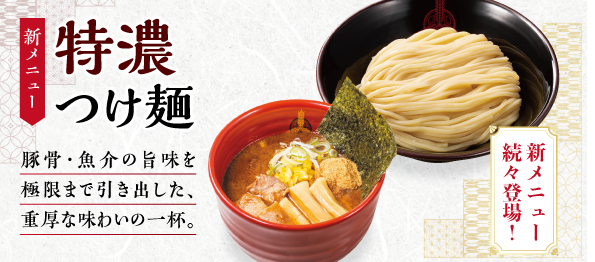 研究を重ね、更に時間と手間暇をかけて煮込み、重厚を超えたドロドロとした“超濃厚”ともいうべきスープに仕立てました。麺にドロリと絡みつき、豚骨魚介の美味しさを余すことなくお召し上がりいただけます。ほのかに香る刻み柚子は、口の中に爽やかな清涼感とアクセントを与え、最後の一滴まで飽きることなく召し上がれる珠玉の逸品となっております。