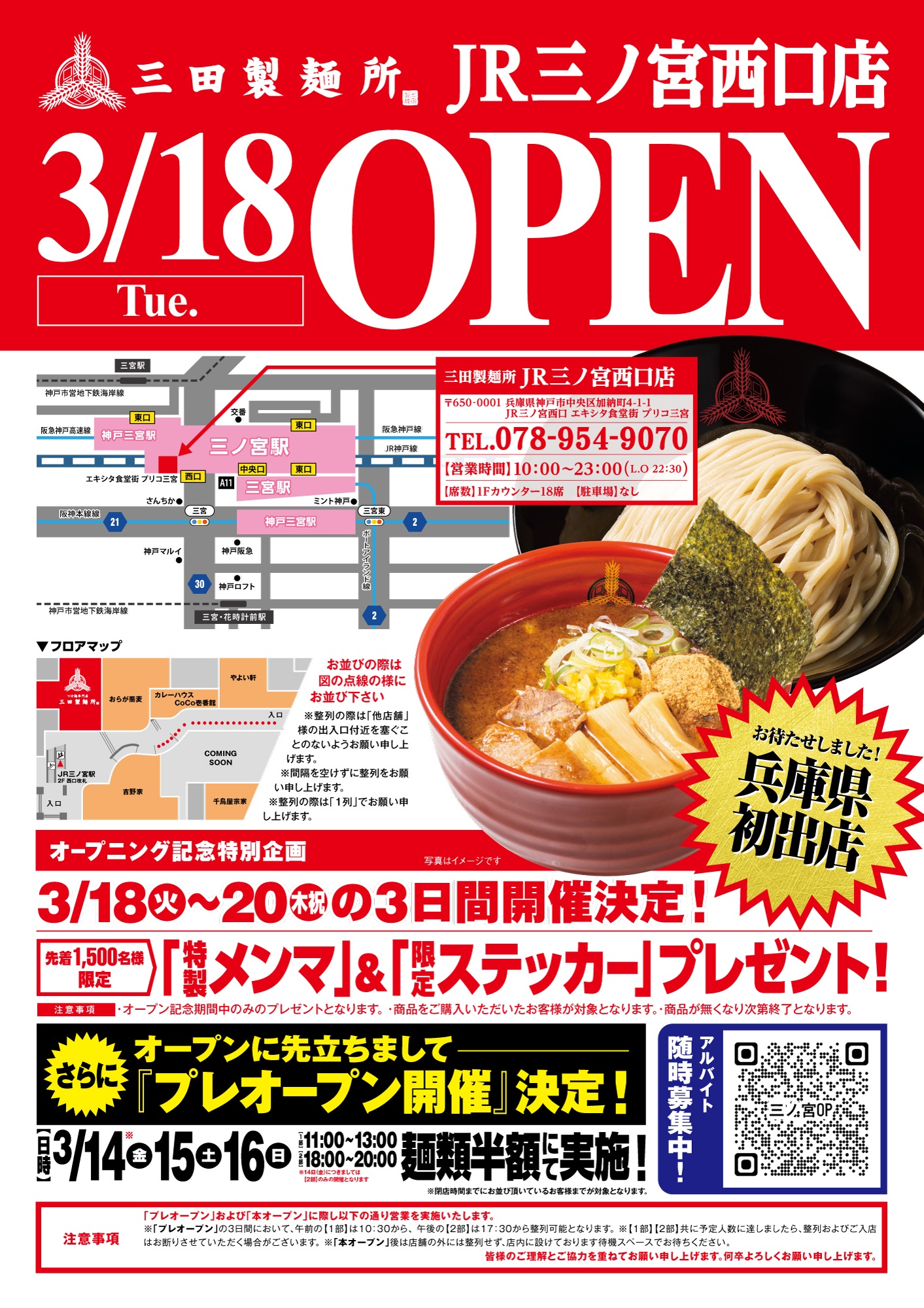兵庫県初出店となる新店『三田製麺所 JR三ノ宮西口店』を、3/18(火)にオープンいたします。