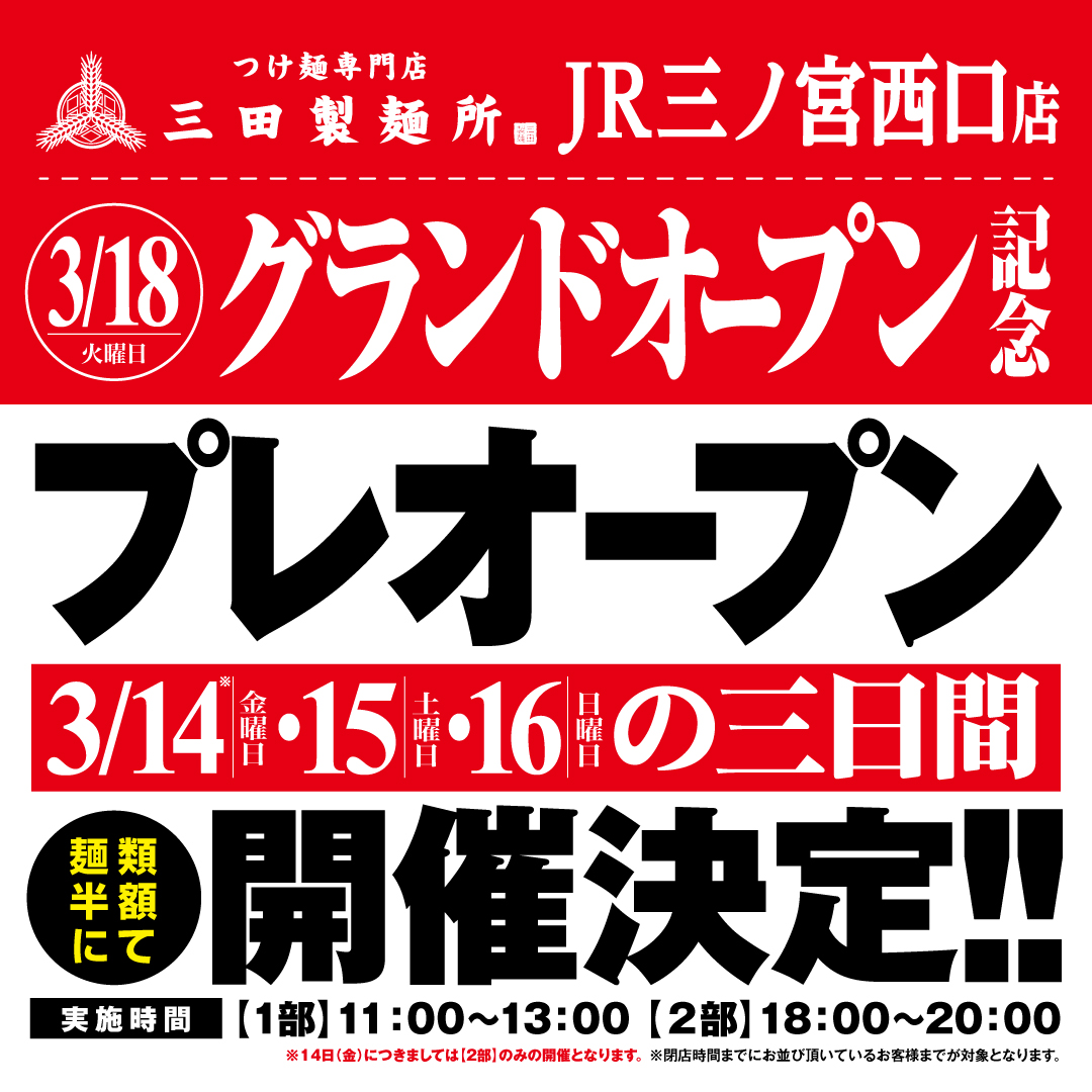 また、3月14日(金)からの三日間は”麺類半額”のプレオープン営業も実施。「すべての人に、満腹と幸福を」のコーポレートミッションに基づき、より多くの人に、“つけ麺の魅力”を伝えるべく営業に励んでまいります。