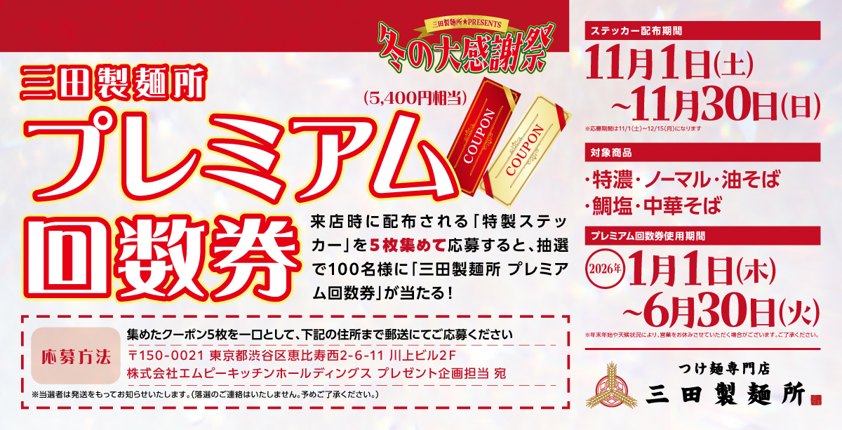 対象商品購入で配布されるステッカーを5枚集め、応募すると抽選で100名様に「三田製麺所 プレミアム回数券(5,400円相当/1,080円×5枚)」をプレゼント。